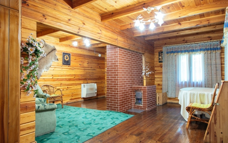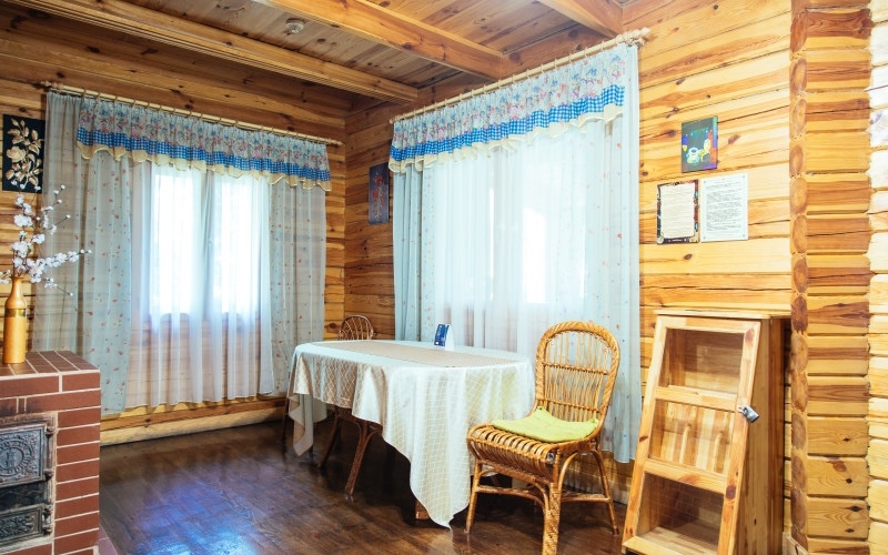 Двухэтажный  двухкомнатный сруб  с балконом и застеклённой террасой с видом на зоопарк и маленькое озеро.