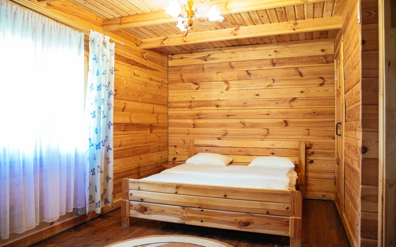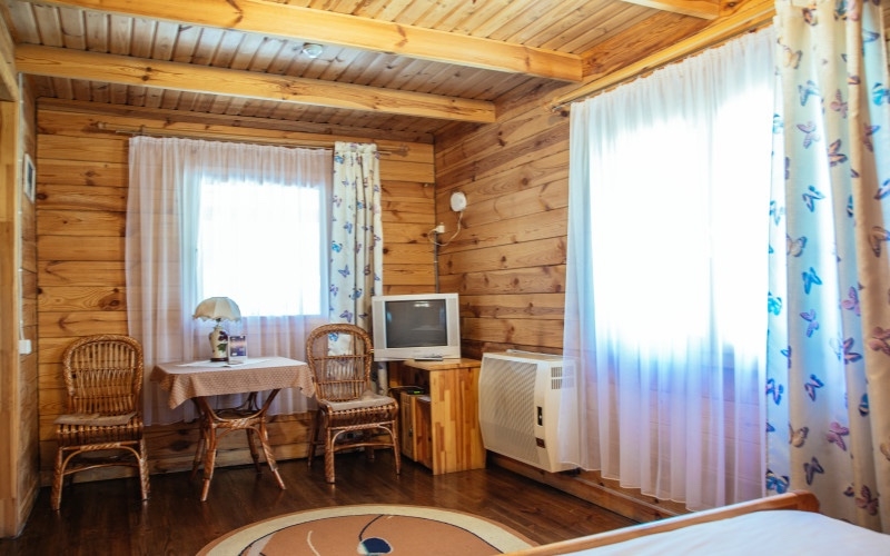 В доме - двуспальная кровать, плетёная мебель, телевизор .
