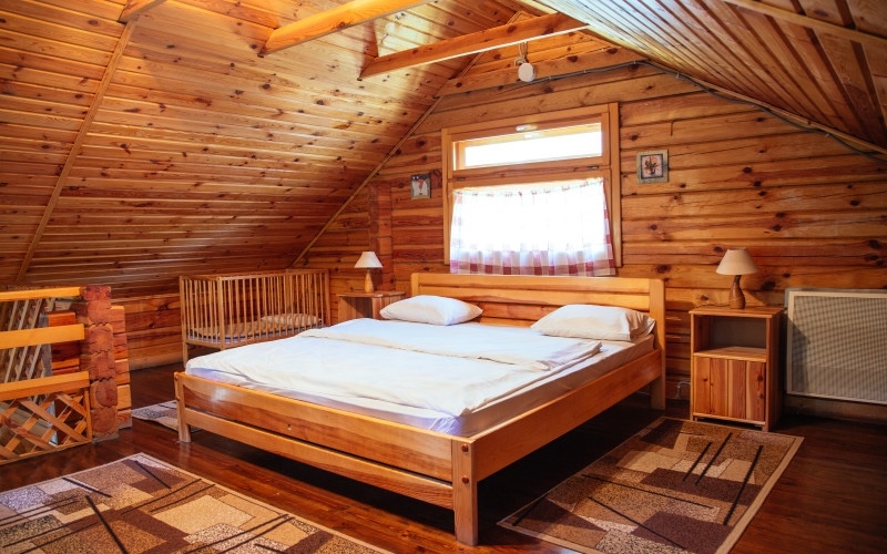 На втором этаже-большая двуспальная кровать, плетёная мебель, балкон.